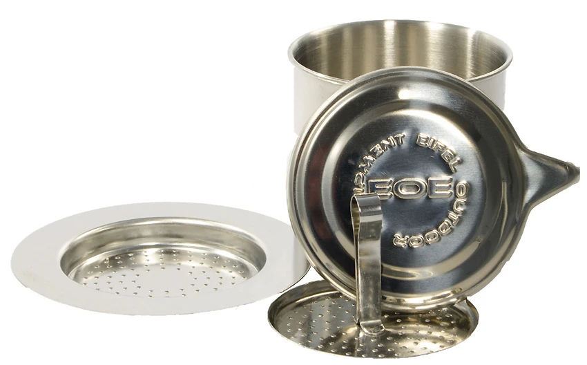 Wer sich nicht mit dem Notnagel „Instantkaffee“ zufrieden geben will, hat hier einen Kaffeefilter, mit dem man eine Tasse/Becher Kaffee aus frischem Kaffeepulver aufgiessen kann. Man kann eine kleine Zeremonie daraus machen, um den Genuss noch zu steigern.