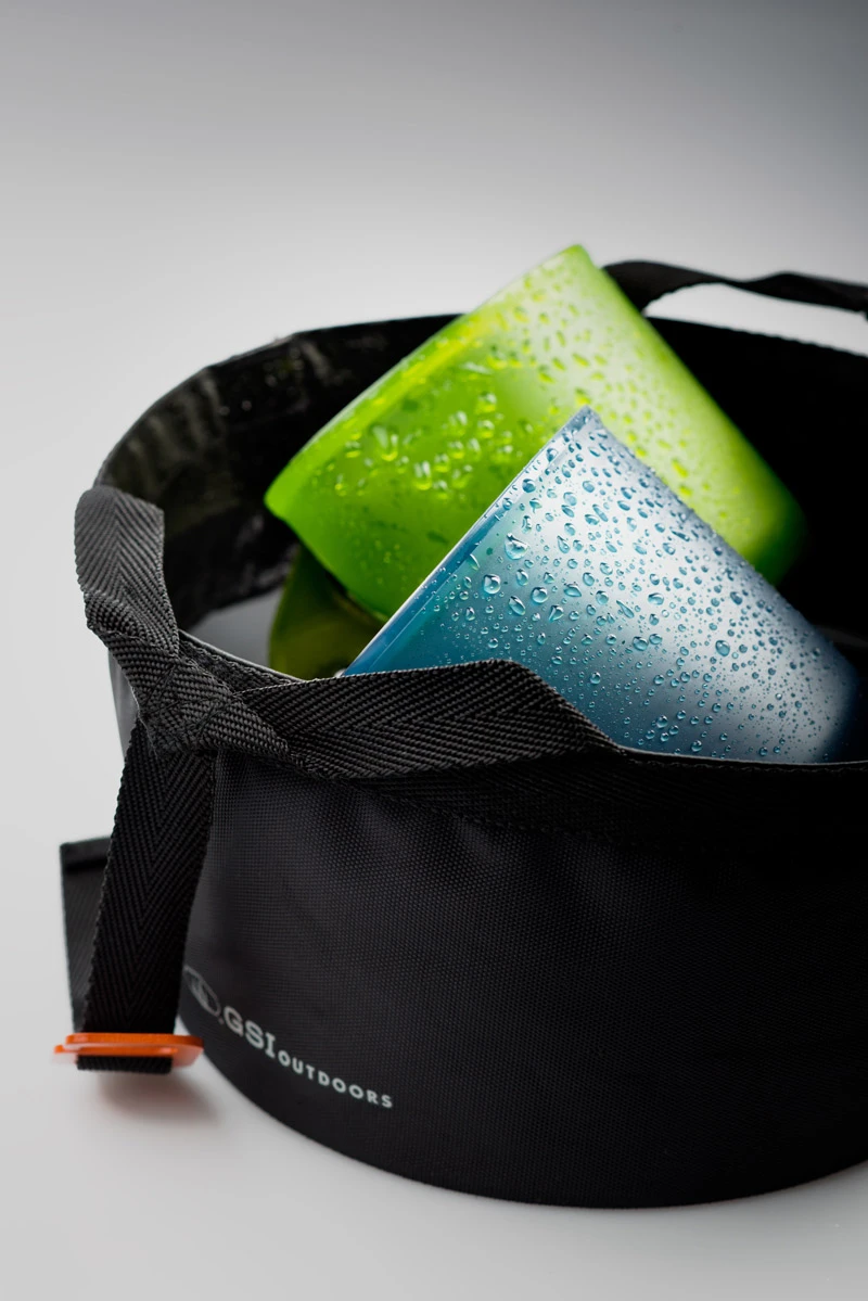- 22-teilig: 2 Töpfe, 1 Pfanne, 1 Deckel, 4 Teller, 4 Isolierbecher, 4 Becherdeckel, 4 Schüsseln, 1 Griffzange, 1 Spülsack