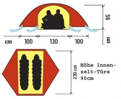 - hoch angesetztes Aussenzelt sorgt fĂŒr sehr gute EntlĂŒftung – der hochgezogene Innenzeltboden schĂŒtzt bei kalten Winden und seitlichem Schlagregen