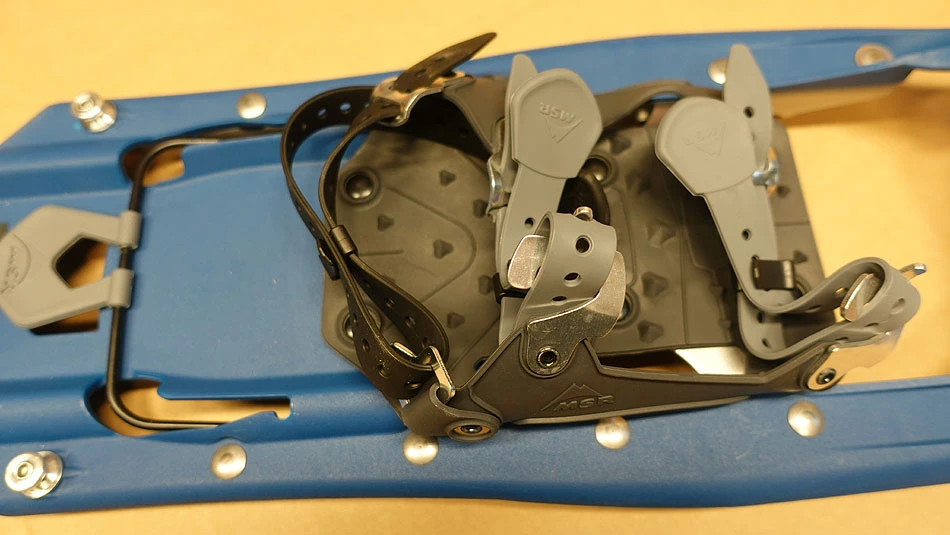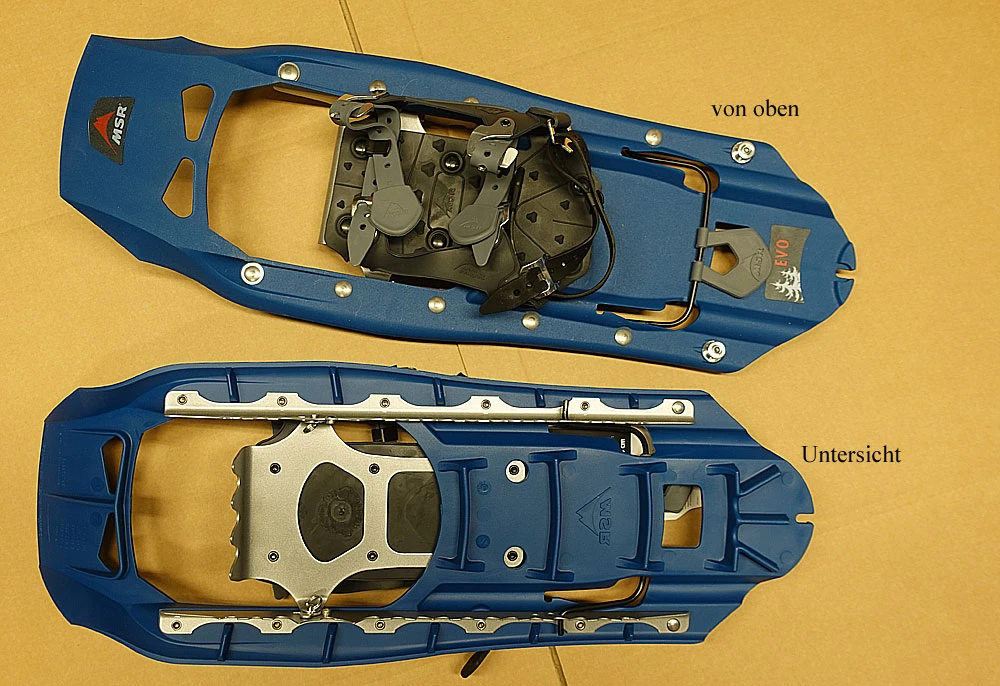 - fester Halt des Schneeschuhs auch auf vereisten Flächen, vorwärts wie seitwarts, durch Steigeisenleisten aus Stahl