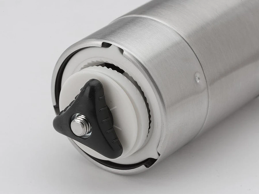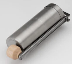Die Kaffeemühle ist einer der drei Bestandteile von SnowPeaks „Field Barista Set“. Sie ist optisch auf den Kessel abgestimmt, die Leistung entspricht einer deutlich grösseren Handmühle, die mit fast den gleichen Bauteilen auch in Kaffeebars eingesetzt wird.