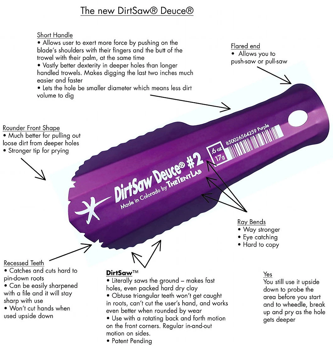 Die (normal große) The Deuce® #2 backpacking Schaufel kann leicht in fester Erde graben, durch Kiefernnadeln dringt sie leicht und Steine kann man auch ausbuddeln – alles für die spurlose Verrichtung „des Geschäfts“ outdoors. Abseits von Toiletten sollte Mensch seine Hinterlassenschaft ca. 10-15 cm in humöse Erde vergraben – was in Europa so gut wie unüblich ist. Trotzdem aber so sinnvoll wäre, wie in den USA, wo in Nationalparks streng auf die Einhaltung der leave-no-trace-Ethik geachtet wird…