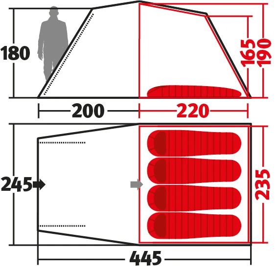- Größe Innenzelt (LxBxH): 220 x 235 x 190 cm