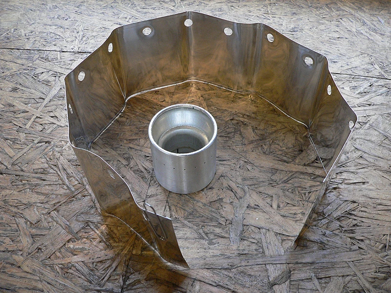 Spiritusbrenner, Windschutz (der früher übliche Bodenreflektor leider seit 10-16 nicht mehr, kann man leicht selber machen, wiegt dann ca. 4 g. Wir empfehlen der Standstabilität wegen einen Eigenbau aus Alu statt Carbon felt)